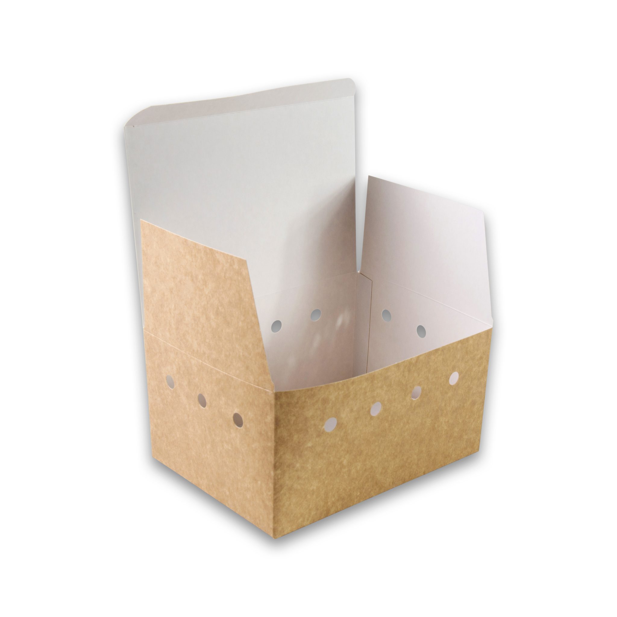 Die Familienschachtel oder das Essenstablett aus Pappe sieht dank der weißen Innenseite hygienisch aus, während die Außenseite im Kraftpapier-Look eine dauerhafte und einzigartige Präsentation gewährleistet. Die Snackpakete werden flach geliefert, so dass sie vor dem Gebrauch wenig Platz einnehmen. Durch die automatische Verriegelung am Boden sind sie sehr benutzerfreundlich und einfach einzurichten.